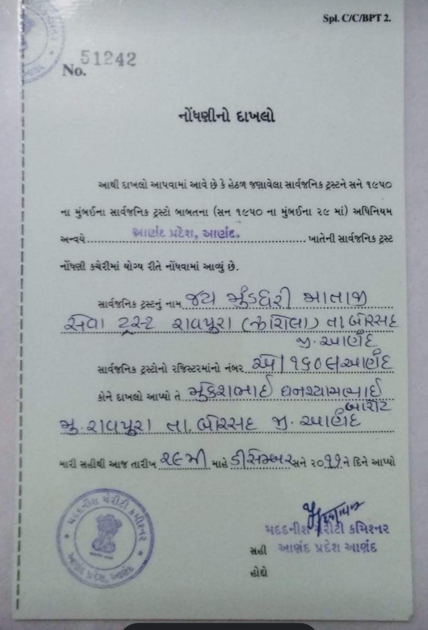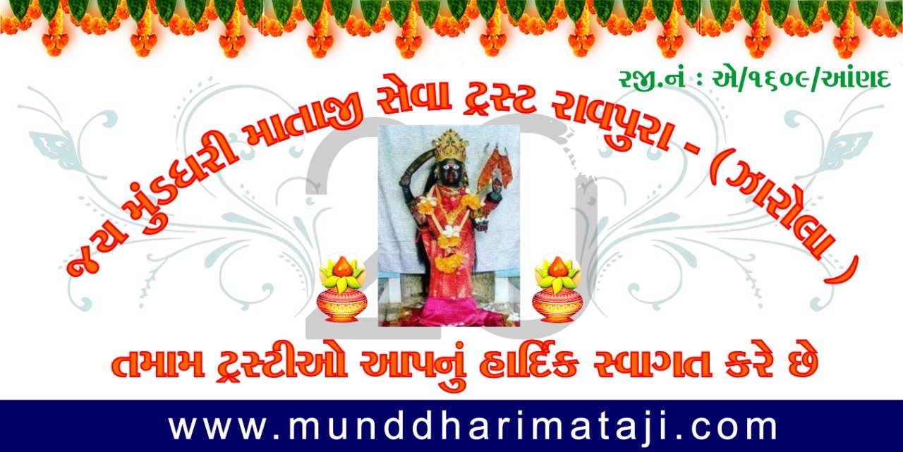 Jay Munddhari Mataji Seva Trust is working since 29th of December 2017, located at Ravpura (zarola) Village, Ta- Borsad Di- Anand, Trust Register Number A/1609/Anand, Trust Certificate Issue By Mukeshbhai Ghanshyambhai Barot Residant at Ravpura, Ta Borsad, Anand