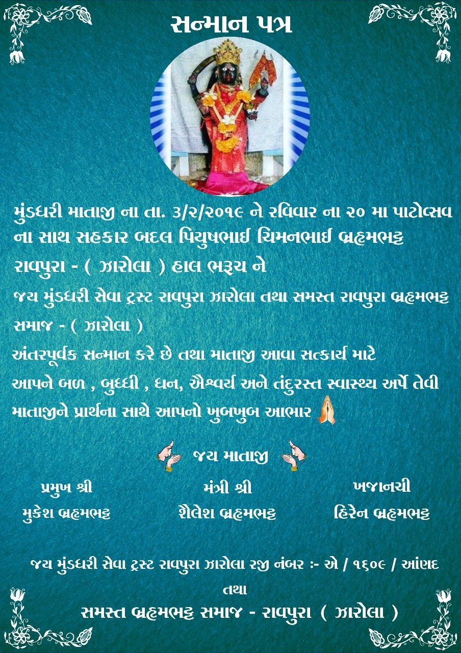 A letter of appreciation is Issue to Piyushbhai Chimanbhai Brahmbhatt for support on 20th Patotsav of Jay Mundhari Mataji Trust which is held on 03/02/2019.