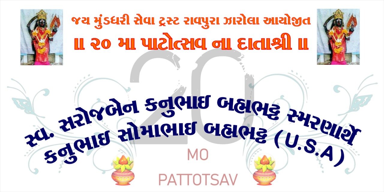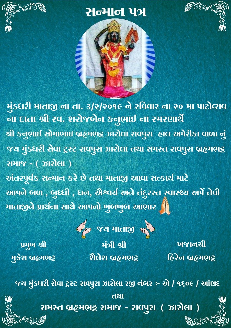A letter of appreciation is Issue to Sarojben Kanubhai for support on 20th Patotsav of Jay Mundhari Mataji Trust which is held on 03/02/2019.